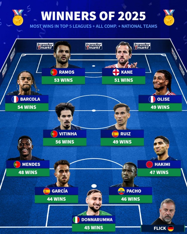 1月3日讯 德国转会市集统计了2025年五大联赛球员俱乐部+国度队的胜场数目,比肩出胜场最多声势,凯恩、奥利塞、阿什拉夫在列。