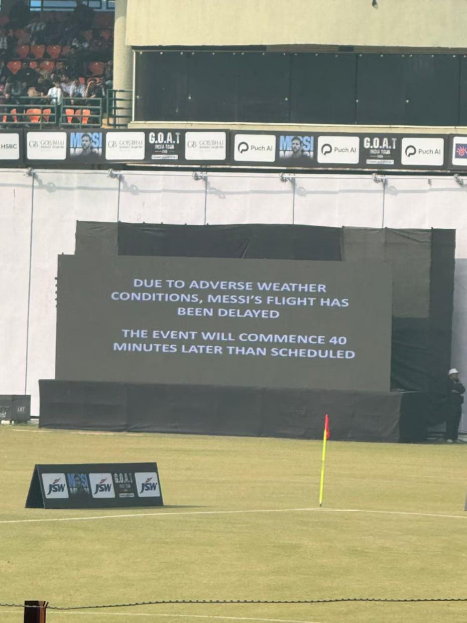 通顺场内大屏幕写说念:“因天气情景恶劣,梅西所乘航班已延误,本场动作将比原定技巧推迟40分钟举行。”