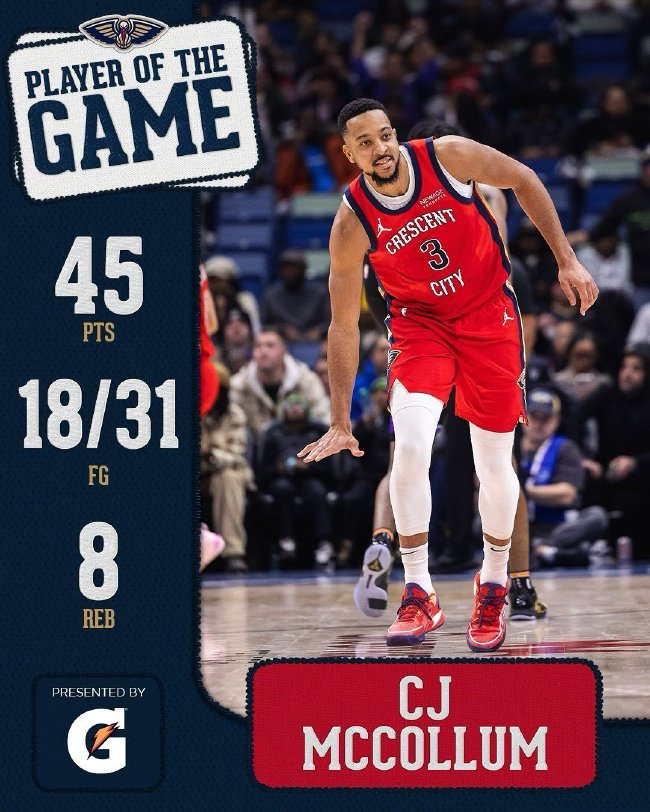 鹈鹕首节便过时近20分,最多时过时达到25分。凭借着下半场的出色流露,鹈鹕将比赛拖入加时,并在加时赛流露出色赢下比赛。麦科勒姆31投18中轰下45分8篮板4助攻率队取胜,鹈鹕赢得4连胜。