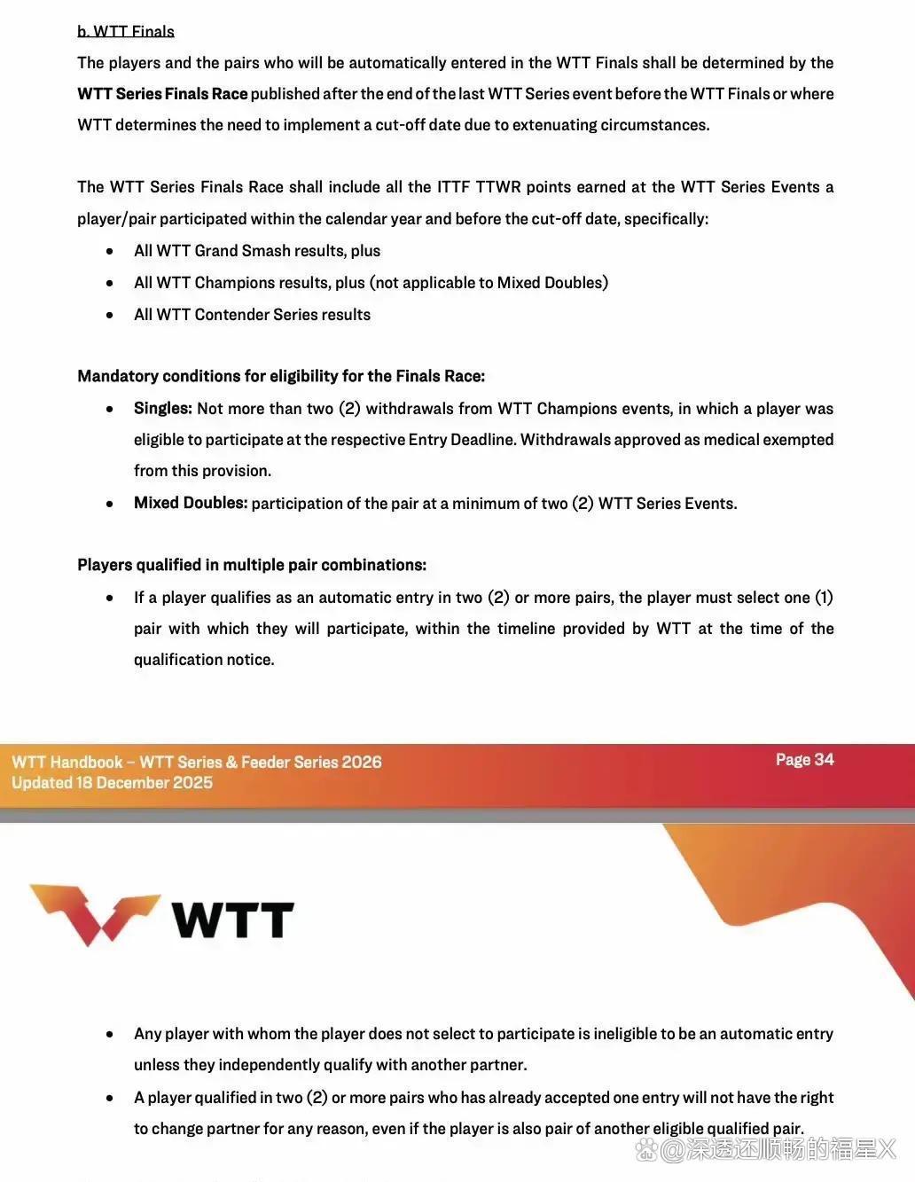 此次新规主要包括四方面内容。为止了选手在WTT总决赛及系列赛中的单项报名数目,幸免主力过度参赛;治愈了赛程,保证通顺员有满盈的休息时间;明确了混双积分和参赛场次的条目,强化了对组合相识性的处分;改造了积分名次和晋级履历的运筹帷幄格式。总体来说,天然强调了通顺员健康,但改造的积分和报名为止如实带来了不少影响。