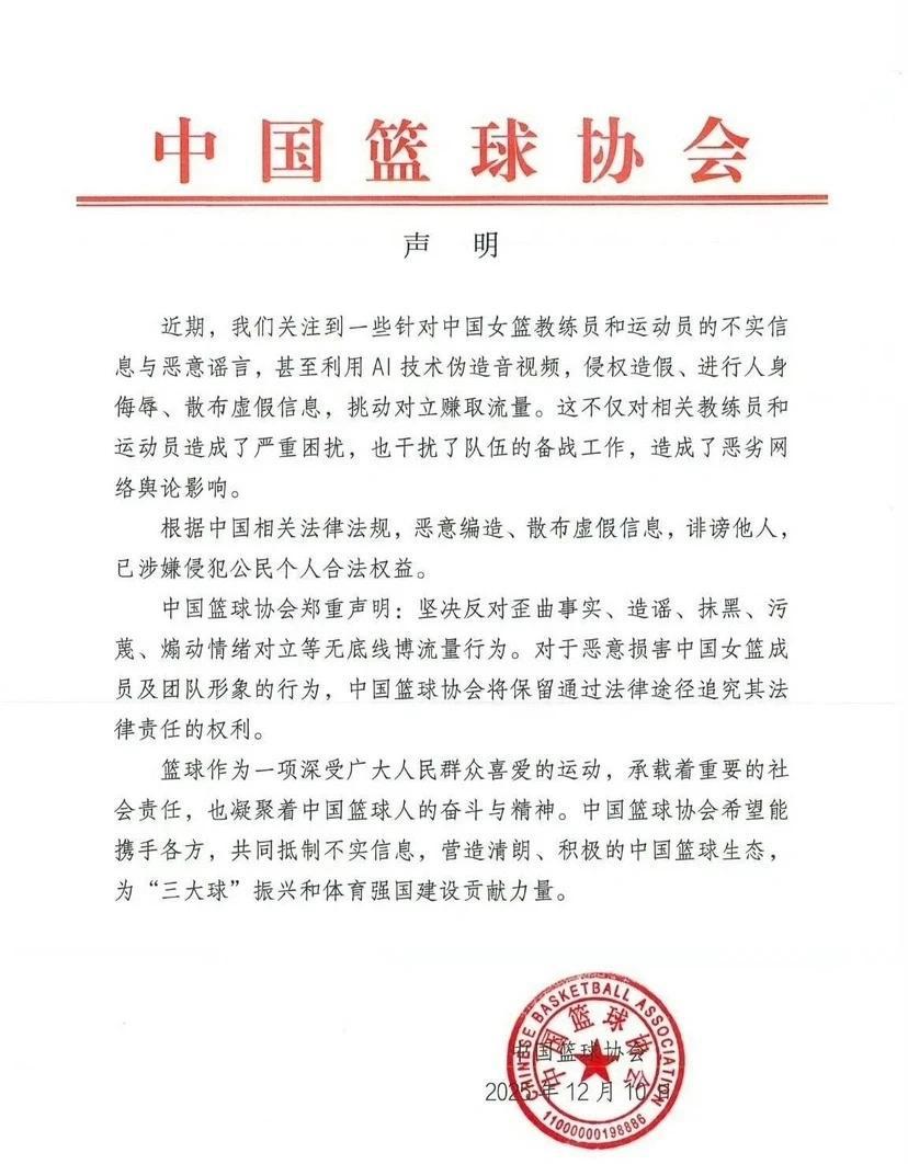 对此,中国篮球协会最近郑重发了声明,明确默示要重办这些坏心驳诘的行径,极端是那些用本领妙技伪造本色并到处传播的,险些可恶。声明里说,这些乌有信息不仅惊扰了畅通员和栽植的往常活命,还影响了球队的进修和备战,变成了很不好的公论氛围。篮协也表态了,将强不会让那些编驳诘言、挑起对立、只为博眼球的东说念主得逞。
